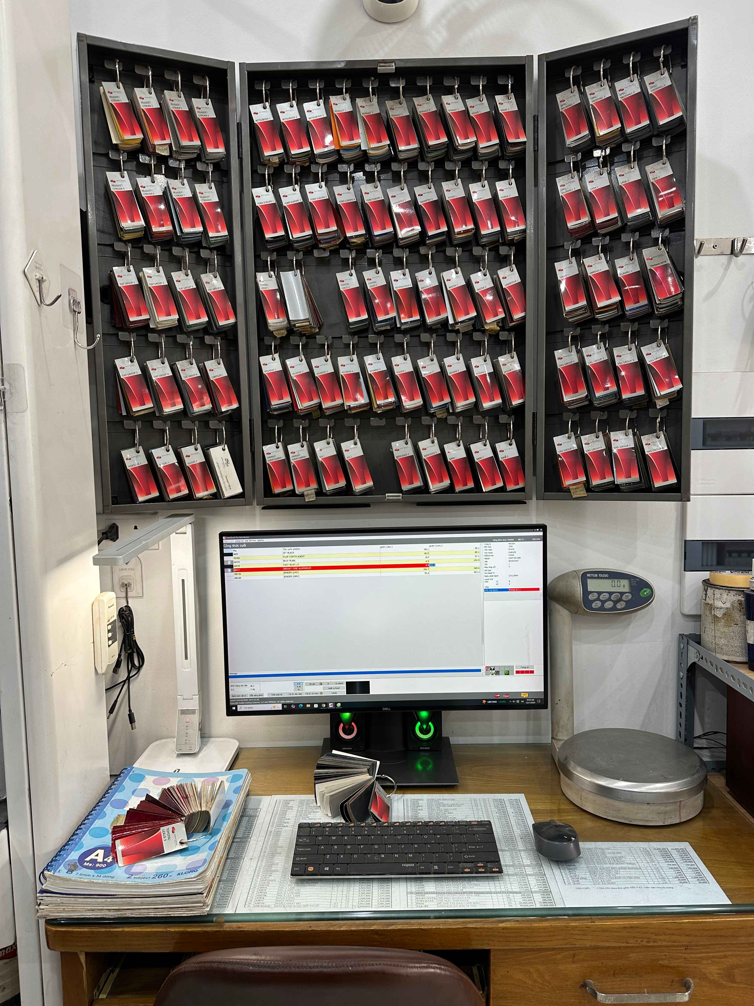 Hệ thống catalogue thẻ màu của các hãng Toyota Lexus, Mercedes, Huyndai, BMW, Mazda,... kết hợp với phần mềm pha sơn được hãng cung cấp và cân tiểu ly giúp màu sơn pha ra đạt độ chính xác tuyệt đối.